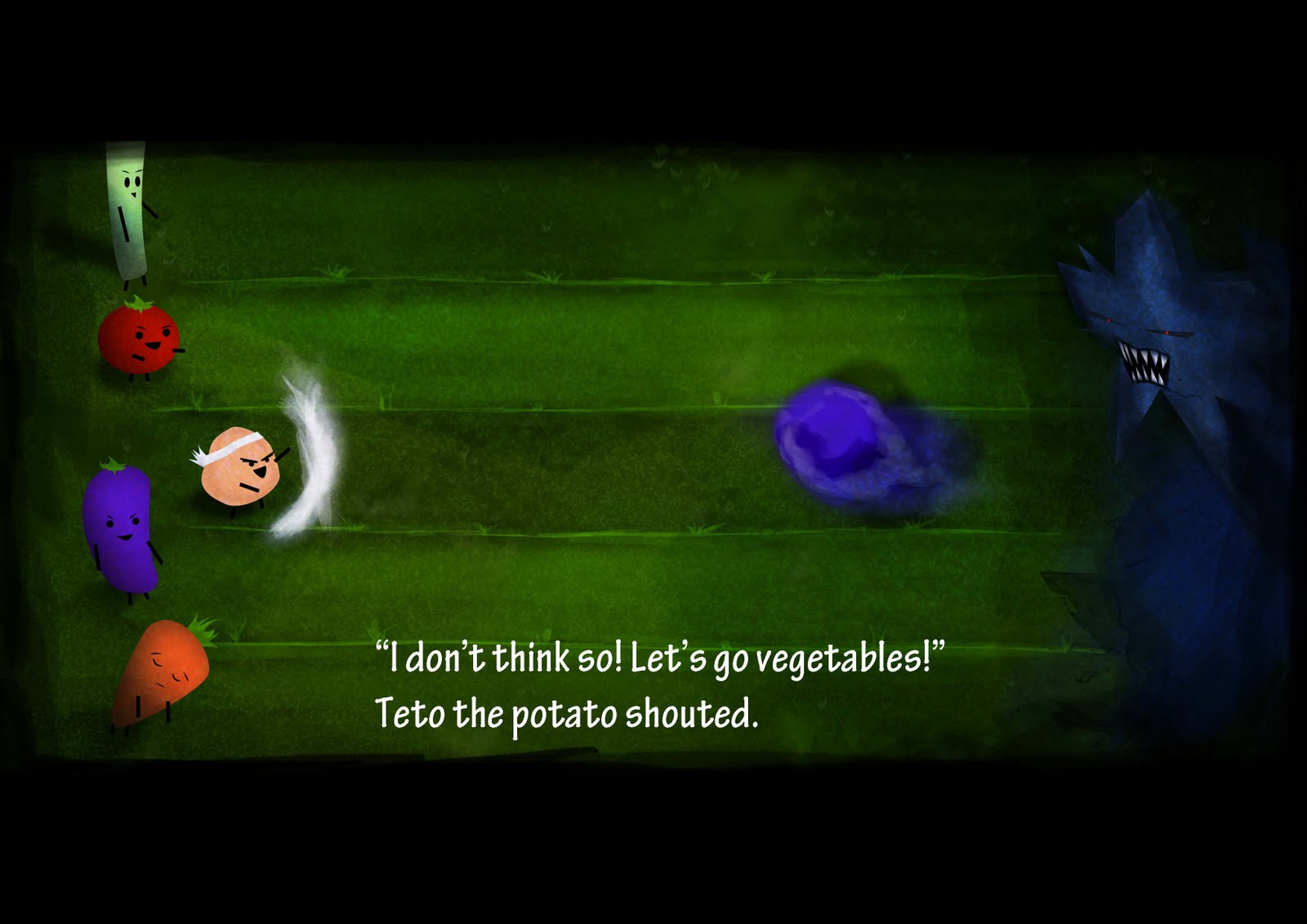 Climax — Suddenly the oversized germs attack the town. The vegetables fight off the germs.